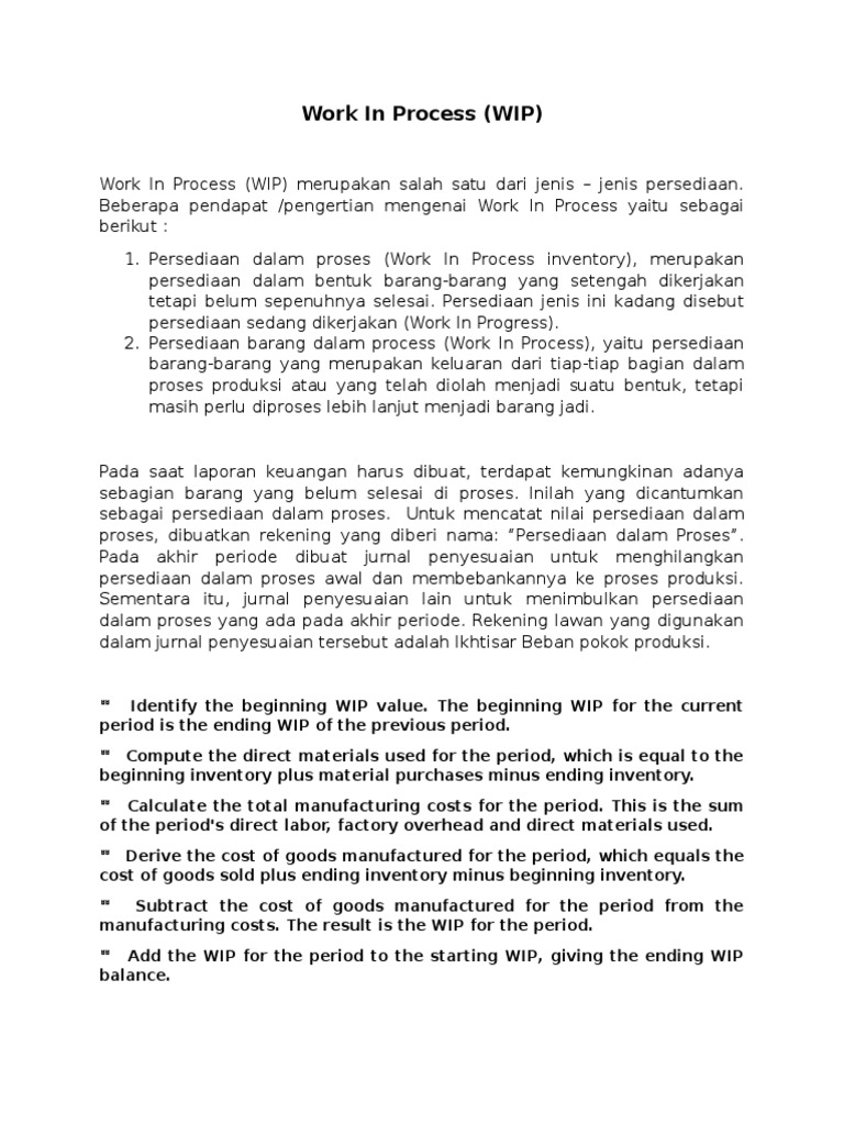 Persediaan work in process mencakup semua jenis persediaan pada tahap peralihan antara persediaan bahan mentah dan produk akhir. Work in process WIP atau barang dalam proses adalah istilah yang mengacu pada inventaris apa pun yang telah dimulai ke dalam produksi tetapi belum selesai pada akhir siklus akuntansi.